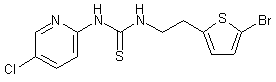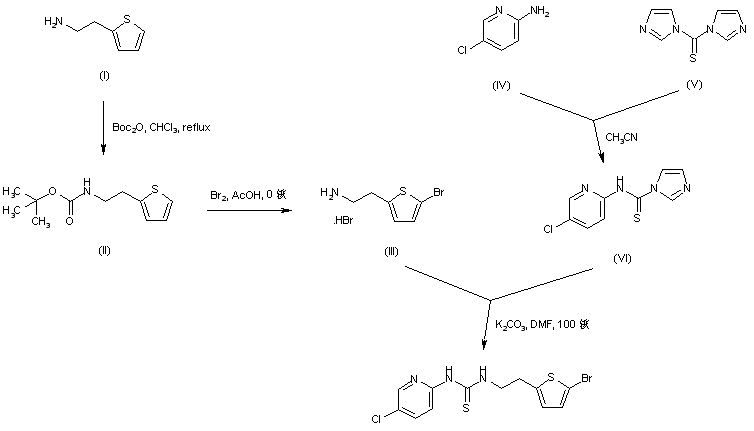 2-(2-Thienyl)ethylamine (I) was protected as the N-Boc derivative (II) with Boc2O in CHCl3. Regioselective halogenation of the thiophene ring of (II) with concomitant Boc group cleavage by means of bromine in cold HOAc yielded the 5-bromothiophene (III). The thioimidazolide (VI) was prepared by reaction of 2-amino-5-chloropyridine (IV) with thiocarbonyl diimidazole (V). Finally, condensation of (VI) with amine (III) in hot DMF furnished the target thiourea.