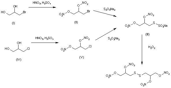 The nitration of 3-bromopropane-1,2-diol (I) with HNO3 and H2SO4 in dichloromethane gives the dinitrate (II), which is treated with Na2S2O3 in hot methanol/water to yield the Bunte salt (III). Finally, this compound is oxidized with H2O2 catalyzed by H2SO4 in ethanol/water to afford the target disulfide. Alternatively, the Bunte salt (III) can also be obtained as follows: The nitration of 3-chloropropane-1,2-diol (IV) with HNO3 and H2SO4 in dichloromethane gives the dinitrate (V), which is then treated with Na2S2O3 as before