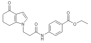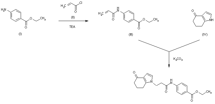 The reaction of 4-aminobenzoic acid ethyl ester (I) with acryloyl chloride (II) by means of TEA in dichloromethane gives the corresponding acrylamide (III), which is condensed with 4,5,6,7-tetrahydro-1H-indol-4-one (IV) by means of K2CO3 in hot DMF to yield NEO-339. (1,2)