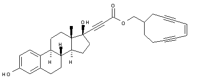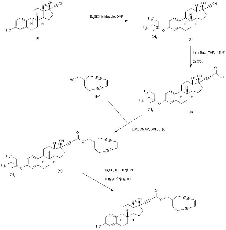 Ethynyl estradiol (I) was protected at the phenolic hydroxyl group as the silyl ether (II) by using triethylsilyl chloride and imidazole. The lithium acetylide derived from (II) was then carboxylated by a stream of CO2 to afford the propiolic acid derivative (III). Subsequent coupling of acid (III) with the cyclic enediine alcohol (IV) in the presence of EDC and DMAP furnished the silyl-protected ester (V). Finally, desilylation of (V) with either Bu4NF or HF穚yridine led to the target compound.