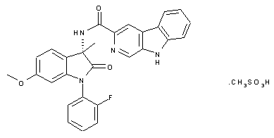 The isatin derivative (III) was prepared by acylation of diarylamine (I) with oxalyl chloride, followed by intramolecular cyclization of the intermediate (II) under Friedel-Crafts reaction conditions. Treatment of (III) with hydroxylamine led to formation of the oxime (IV), which was further reduced to amine (V) by catalytic hydrogenation over Pd/C. After protection of amine (V) as the benzyl carbamate (VI), alkylation with iodomethane in the presence of K2CO3 produced the 3-methyl oxindole (VII). Removal of the N-carbobenzoxy group of (VII) was achieved by catalytic hydrogenation over Pd/C to yield the deprotected amine, which was resolved by means of dibenzoyl-L-tartaric acid. The target (S)-amine (VIII) was finally acylated with beta-carboline-3-carbonyl chloride (IX) to furnish the title amide.