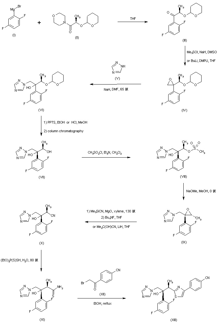 Addition of 2,5-difluorophenylmagnesium bromide (I) to the O-tetrahydropyranyl lactic acid amide (II) afforded the propiophenone derivative (III). Oxirane (IV) was then obtained by reaction of ketone (III) with the sulfur ylide generated from trimethylsulfoxonium iodide and either NaH or BuLi. Epoxide ring opening with the sodium salt of 1,2,4-triazole (V) led to the triazolyl alcohol (VI) as a mixture of diastereoisomers. After acid hydrolysis of the tetrahydropyranyl protecting group of (VI), the resultant mixture of diols was separated by column chromatography. The desired (R,R) diastereoisomer (VII) was converted to epoxide (IX) via formation of mesylate (VIII), which was subsequently cyclized in the presence of NaOMe. Nitrile (X) was then obtained by reaction of oxirane (IX) with either trimethylsilyl cyanide, followed by desilylation with Bu4NF, or with acetone cyanohydrin and LiH. Conversion of nitrile (X) into thioamide (XI) was accomplished by treatment with diethyl dithiophosphate. Cyclization of thioamide (XI) with 4-cyanophenacyl bromide (XII) gave rise to the thiazole derivative (XIII).