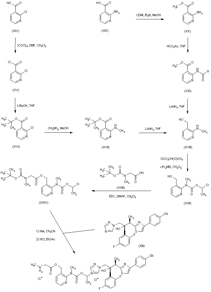 The intermediate amino alcohol (XVIII) was prepared by two ways. 2-Chloronicotinic acid (XIV) was converted to the corresponding acid chloride (XV) by treatment with oxalyl chloride, and then reacted with potassium tert-butoxide to afford the tert-butyl ester (XVI). Displacement of the chloride group of (XVI) with methanolic methylamine gave rise to the 2-(methylamino)nicotinic ester (XVII), which was then reduced to alcohol (XVIII) employing LiAlH4. Alternatively, 2-aminonicotinic acid (XIX) was esterified to (XX) by means of 2-chloro-1,3-dimethylimidazolinium chloride in MeOH. The amino group of (XX) was acylated with formic acetic anhydride to give formamide (XXI). Amino alcohol (XVIII) was then obtained by reduction of amido ester (XXI) in the presence of LiAlH4. Condensation of (XVIII) with 1-chloroethyl chloroformate produced the carbamate alcohol (XXII), which was subsequently esterified with N-Boc-sarcosine (XXIII) by means of EDC yielding (XXIV) (2). Quaternization of the triazole compound (XIII) with the chloroethyl carbamate (XXIV) in the presence of NaI furnished the corresponding triazolium salt, which was finally subjected to acidic Boc group cleavage to produce the title compound.