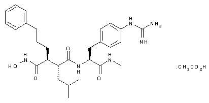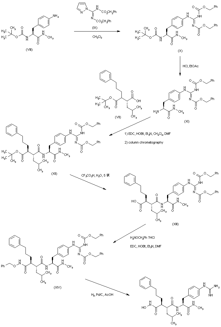 N-Boc-L-4'-Aminophenylalanine-N-methylamide (VIII) was converted to the guanidine derivative (X) by reaction with pyrazole-N,N'-bis(benzyloxycarbonyl)carboxamidine (IX). After acidic Boc group cleavage in (IX), the resultant amino amide (XI) was coupled with the carboxylic acid (VII) to produce a diastereomeric mixture of amides, which were separated by column chromatography. The desired isomer (XII) was then treated with 95% aqueous trifluoroacetic acid to remove the tert-butyl ester group, yielding acid (XIII). Coupling of (XIII) with O-benzyl hydroxylamine furnished the O-benzyl hydroxamate (XIV). Finally, the benzyl and benzyloxycarbonyl protecting groups of (XIV) were removed by catalytic hydrogenation over Pd/C to afford the title compound.