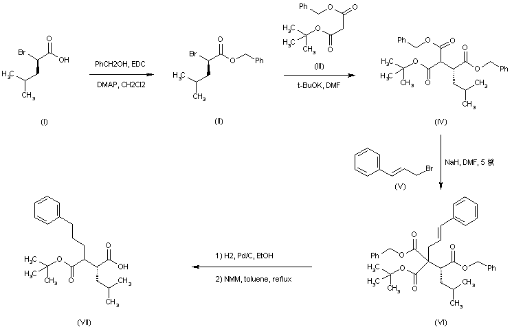 (R)-2-Bromo-4-methylpentanoic acid (I) was protected as the benzyl ester (II) and subsequently condensed with benzyl tert-butyl malonate (III) in the presence of potassium tert-butoxide to furnish the triester (IV) as an epimeric mixture. Alkylation of (IV) with cinnamyl bromide (V) produced adduct (VI). The key intermediate (VII) was then obtained by catalytic hydrogenation of the benzyl esters and olefin double bond of (VI), followed by thermal malonate decarboxylation.