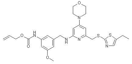 Amine (XII) was converted into allyl carbamate (XIII) by reaction with allyl chloroformate. The silylethoxymethyl protecting group of (XIII) was then removed by acidic treatment to provide alcohol (XIV), which was further activated as the corresponding mesylate (XV). Condensation of mesylate (XV) with 5-ethyl-2-mercaptothiazole (XVI) gave thioether (XVII). The N-Boc group of (XVII) was finally cleaved by treatment with trifluoroacetic acid to yield the title compound.