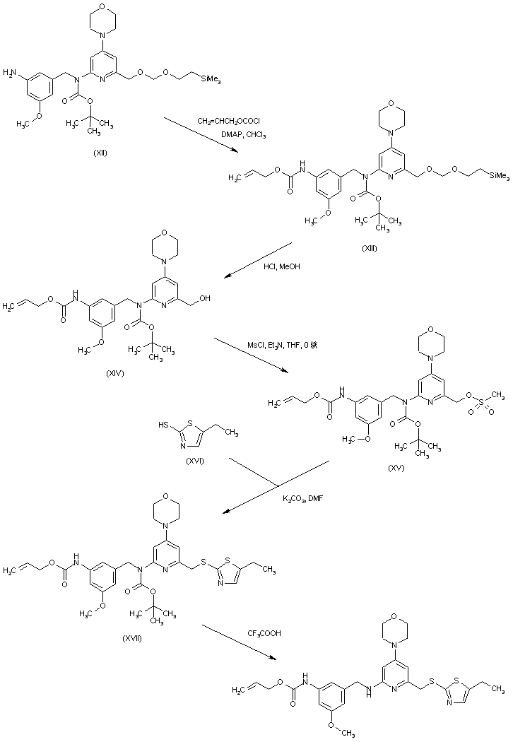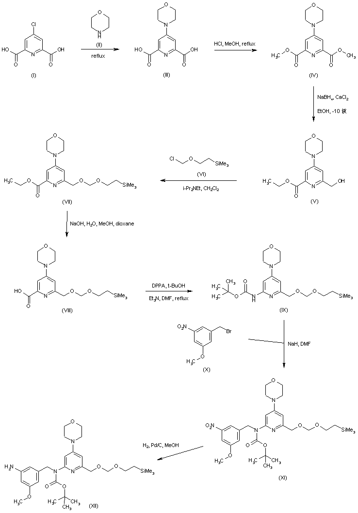 The condensation of 4-chloro-2,6-pyridinedicarboxylic acid (I) with morpholine (II) afforded the morpholinopyridinedicarboxylic acid (III), which was further esterified with MeOH and HCl to produce diester (IV). Reduction of (IV) with NaBH4 and CaCl2 gave hydroxy ester (V). After protection of the hydroxyl group of (V) as the trimethylsilylethoxymethyl derivative (VII), the ester group was hydrolyzed under basic conditions yielding acid (VIII). This was then subjected to a Curtius rearrangement with DPPA in the presence of tert-butanol to generate the tert-butyl carbamate (IX). Alkylation of carbamate (IX) with 3-methoxy-5-nitrobenzyl bromide (X) and NaH furnished the N-benzyl carbamate derivative (XI). The nitro group of (XI) was then reduced to amine (XII) by catalytic hydrogenation over Pd/C.