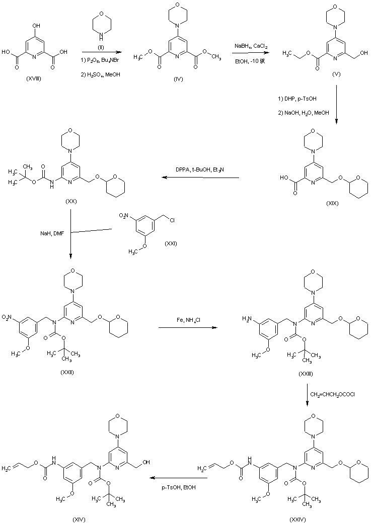 A similar method, but using a different protection strategy, has been reported. 4-Hydroxy-2,6-pyridinedicarboxylic acid (XVIII) was condensed with morpholine (II) to provide, after Fischer esterification, the morpholinopyridine diester (IV). Reduction of (IV) with calcium borohydride furnished hydroxy ester (V). Protection of (V) as the corresponding tetrahydropyranyl ether, followed by ester group saponification, afforded (XIX). Curtius rearrangement of acid (XIX) in the same conditions as above gave carbamate (XX), which was alkylated with benzyl chloride (XXI) yielding (XXII). After reduction of the nitroderivative (XXII) with iron and ammonium chloride, the resultant amine (XXIII) was acylated by allyl chloroformate to produce carbamate (XXIV). Then, acidic treatment removed the tetrahydropyranyl-protecting group to afford alcohol (XIV), which was finally processed as in the above method.