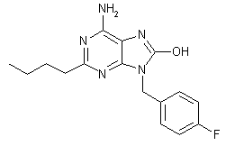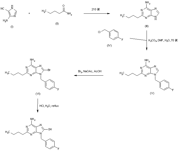 Condensation of 4-amino-5-cyanoimidazole (I) with pentanamide (II) upon heating at 210 C produced the 2-butyladenine (III). Subsequent alkylation of (III) with 4-fluorobenzyl chloride (IV) yielded the 9-fluorobenzyl adenine (V). This was brominated at position 8 using Br2 and NaOAc in HOAc. The resultant 8-bromo adenine (VI) was finally hydrolyzed under acidic conditions to the title 8-hydroxy derivative.