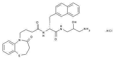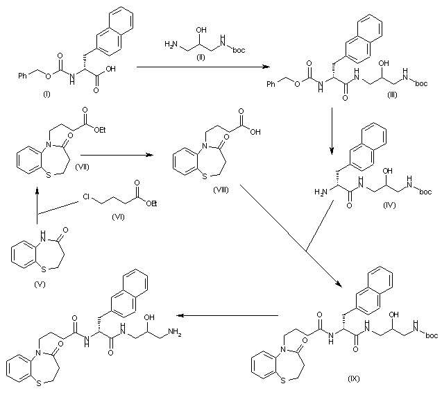 The monoamine intermediate (IV) has been obtained as follows: The condensation of 2(R)-(benzyloxycarbonylamino)-3-(2-naphthyl)propionic acid (I) with 3-(tert-butoxycarbonylamino)-2-hydroxypropylamine (II) gives the corresponding amide (III), which is regioselectively deprotected by hydrogenolysis to yield the desired monoamine (IV). The condensation of 2,3,4,5-tetrahydro-1,5-benzothiazepin-4-one (V) with 4-chlorobutyric acid ethyl ester (VI) gives the corresponding cyclic amide (VII), which is hydrolyzed to afford the carboxylic acid (VIII). The condensation of acid (VIII) with the intermediate amine (IV) provides the amide (IX), which is finally N-deprotected to furnish the target diamide.