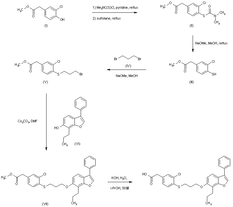 Condensation of methyl 3-chloro-4-hydroxyphenylacetate (I) with N,N-dimethylthiocarbamoyl chloride, followed by thermal rearrangement in refluxing sulfolane leads to the thiocarbamate (II). Hydrolysis of (II) with NaOMe affords thiophenol (III), which is alkylated with 1,3-dibromopropane (IV) furnishes the bromopropyl thioether (V) (2). This is then condensed with the hydroxybenzofuran (VI) in the presence of Cs2CO3 yielding adduct (VII). Finally, saponification of the methyl ester group of (VII) with KOH furnishes the target carboxylic acid (1,2).