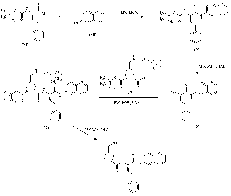 Coupling of N-Boc-D-benzylalanine (VII) and 6-aminoquinoline (VIII) by means of EDC provided amide (IX). After trifluoroacetic acid-promoted Boc group cleavage in (IX), the resultant amino amide (X) was coupled with the proline derivative (VI), yielding (XI). The Boc protecting groups of (XI) were finally removed by treatment with trifluoroacetic acid.