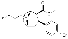 | 合成路线图解说明: Conjugate addition of 4-(trimethylsilyl)phenylmagnesium bromide (II) to anhydroecgonine methyl ester (I) afforded regioselectively the 2-beta-carbomethoxy-3-beta-aryl tropane (III). Iododesilylation of (III) using ICl or iodine in the presence of AgBF4 gave the iodophenyl derivative (IV). Hydrolysis of the ester function of (IV) in aqueous dioxan yielded the corresponding acid (V). Treatment of (V) with POCl3 provided the acid chloride (VI), which was condensed with 1,3-propanediol monomesylate (VII) to yield ester (VIII). Finally, nucleophilic displacement of the mesylate group of (VIII) with tetrabutylammonium fluoride in refluxing THF afforded the title fluoropropyl ester. |