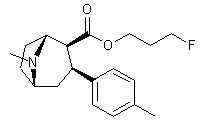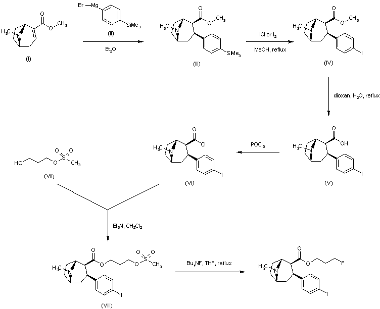 | 合成路线图解说明: Conjugate addition of 4-(trimethylsilyl)phenylmagnesium bromide (II) to anhydroecgonine methyl ester (I) afforded regioselectively the 2-beta-carbomethoxy-3-beta-aryl tropane (III). Iododesilylation of (III) using ICl or iodine in the presence of AgBF4 gave the iodophenyl derivative (IV). Hydrolysis of the ester function of (IV) in aqueous dioxan yielded the corresponding acid (V). Treatment of (V) with POCl3 provided the acid chloride (VI), which was condensed with 1,3-propanediol monomesylate (VII) to yield ester (VIII). Finally, nucleophilic displacement of the mesylate group of (VIII) with tetrabutylammonium fluoride in refluxing THF afforded the title fluoropropyl ester. |