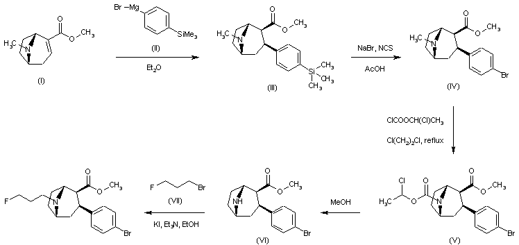 | 合成路线图解说明: Conjugate addition of 4-(trimethylsilyl)phenylmagnesium bromide (II) to anhydroecgonine methyl ester (I) afforded regioselectively the 2-beta-carbomethoxy-3-beta-aryl tropane (III). Bromodesilylation of (III) using NaBr and N-chlorosuccinimide gave the bromophenyl derivative (IV). Amine demethylation was accomplished by reaction of (IV) with 1-chloroethyl chloroformate, followed by hydrolysis and decarboxylation of the intermediate carbamate (V) upon treatment with methanol. The resulting secondary amine (VI) was then alkylated with 3-fluoropropyl bromide (VII) to furnish the title fluoropropyl amine. |