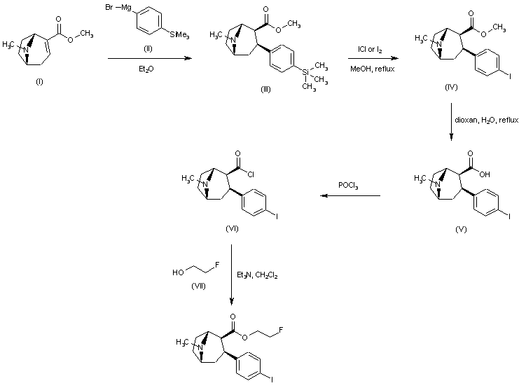 | 合成路线图解说明: Conjugate addition of 4-(trimethylsilyl)phenylmagnesium bromide (II) to anhydroecgonine methyl ester (I) afforded regioselectively the 2-beta-carbomethoxy-3-beta-aryl tropane (III). Iododesilylation of (III) using ICl or iodine in the presence of AgBF4 gave the iodophenyl derivative (IV). Hydrolysis of the ester function of (IV) in aqueous dioxan yielded the corresponding acid (V). Treatment of (V) with POCl3 provided the acid chloride (VI), which was finally condensed with 2-fluoroethanol (VII) to yield the title fluoroethyl ester. |