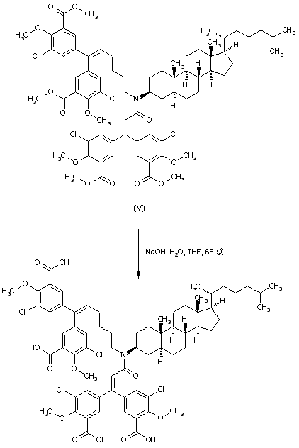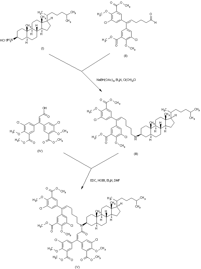 Reductive alkylation of 3-beta-aminocholestane (I) with the known aldehyde (II) using sodium triacetoxyborohydride provided the secondary amine (III). This was then coupled with carboxylic acid (IV) in the presence of EDC and HOBt to afford the corresponding amide (V).