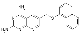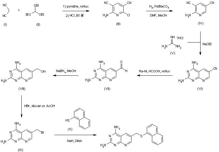 Pyridine (III) was prepared by condensation of malononitrile (I) with triethyl orthoformate (II) in refluxing pyridine, followed by treatment with concentrated HCl. Dechlorination of (III) was effected by hydrogenolysis in the presence of Pd on BaCO3. The dechlorinated pyridine dinitrile (IV) was cyclized with guanidine (V), yielding the pyridopyrimidine (VI). Reduction of the nitrile function of (VI) to aldehyde (VII) was carried out using formic acid and Raney-Ni. This was further reduced to alcohol (VIII) with NaBH4. Bromination of the alcohol (VIII) by means of HBr resulted in bromide (IX). Nucleophilic displacement of the bromide group of (IX) with the sodium salt of 1-naphthalenethiol (X) afforded the target sulfide.