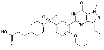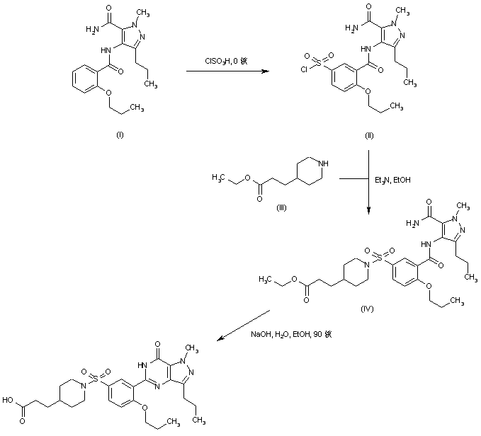 Chlorosulfonylation of the benzamidopyrazole (I) to give (II) was performed with neat chlorosulfonic acid at 0 C. Coupling of sulfonyl chloride (II) with the piperidinopropanoate (III) provided sulfonamide (IV). Finally, cyclization of (IV) with concomitant ester hydrolysis under basic conditions furnished the target pyrazolopyrimidine.