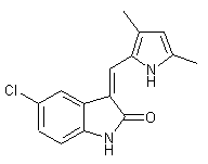 | 合成路线图解说明: Aldehyde (II) was prepared by Vilsmeier-Haack formylation of 2,4-dimethylpyrrole (I). Subsequent condensation of the pyrrole aldehyde (II) with 5-chlorooxindole (III) in the presence of piperidine furnished the title compound. |