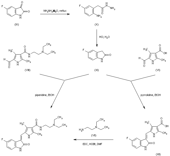 5-Fluoroisatin (IX) is heated with neat hydrazine hydrate to produce 2-amino-5-fluorophenylacetic hydrazide (X), which, upon acidic treatment cyclizes to 5-fluorooxindole (XI). Subsequent condensation of oxindole (XI) with the formylpyrrole carboxamide (VIII) in the presence of piperidine in hot EtOH leads to the title compound. In an alternative procedure, oxindole (XI) is condensed with the formylpyrrole carboxylic acid (VI) giving (XII), which is further coupled with 2-(diethylamino)ethylamine (VII) in the presence of EDC/HOBt to yield the target carboxamide.