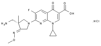 Condensation of the intermediate pyrrolidine (XII) with the fluoronaphthyridine (XIX) provided adduct (XX). Simultaneous cleavage of the ketal and N-Boc groups under acidic conditions gave (XXI). The keto group of (XXI) was finally converted to the title O-methyloxime by treatment with O-methylhydroxylamine in pyridine.