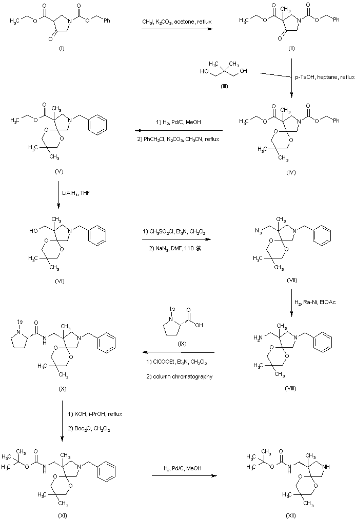 Alkylation of ethyl 1-benzyloxycarbonyl-3-oxopyrrolidine-4-carboxylate (I) with iodomethane and K2CO3 produced the 4-methylpyrrolidine (II). The keto group of (III) was then protected as the corresponding ketal (IV) with 2,2-dimethyl-1,3-propanodiol (III). Replacement of the benzyloxycarbonyl protecting group of (IV) with a benzyl group (V) was accomplished by catalytic hydrogenolysis, followed by alkylation of the resulting pyrrolidine with benzyl chloride. The ester group of (V) was then reduced to the primary alcohol (VI) using LiAlH4. After conversion of alcohol (VI) to the corresponding mesylate, displacement with NaN3 provided the alkyl azide (VII). This was reduced to the primary amine (VIII) by catalytic hydrogenation over Raney-Ni. Resolution of the racemic amine (VIII) was carried out via acylation with N-tosyl-L-proline (IX), followed by chromatographic separation of the diastereomeric amides. Base-promoted hydrolysis of the chiral auxiliary from the desired diastereoisomer (X) provided the (R)-amine, which was further protected as the N-Boc derivative (XI). The N-benzyl group of (XI) was then removed by catalytic hydrogenolysis over Pd/C to yield the target pyrrrolidine (XII).