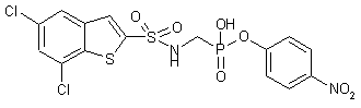 Alkylation of 2,5-dichlorothiophenol (I) with bromoacetaldehyde diethyl acetal (II) produced thioether (III). Benzothiophene (IV) was then obtained by cyclization of (III) under Friedel-Crafts conditions in the presence of polyphosphoric acid. Metalation of benzothiophene (IV) with BuLi at -78 C, followed by addition of sulfur dioxide gave rise to the sulfinic acid (V). This was converted to the sulfonyl chloride (VI) by chlorination with N-chlorosuccinimide, and further treatment of (VI) with ammonium hydroxide provided the sulfonamide (VII). Addition of formaldehyde to the benzothiophene-2-sulfonamide (VII), followed by condensation with trimethyl phosphite, furnished the dimethyl (sulfonamidomethyl)phosphonate (VIII). The phosphonate ester function of (VIII) was then hydrolyzed by means of bromotrimethylsilane, producing phosphonic acid (IX). This was finally coupled to 4-nitrophenol (X) using trichloroacetonitrile in hot pyridine to afford the title mono-phosphonate ester.