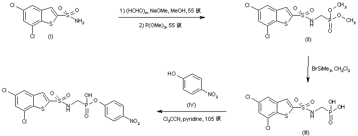 Addition of formaldehyde to 5,7-dichlorobenzothiophene-2-sulfonamide (I), followed by condensation with trimethyl phosphite, furnished the dimethyl (sulfonamidomethyl) phosphonate (II). The phosphonate ester function of (II) was then hydrolyzed by means of bromotrimethylsilane, producing phosphonic acid (III). This was finally coupled to 4-nitrophenol (IV) using trichloroacetonitrile in hot pyridine to afford the title mono-phosphonate ester.