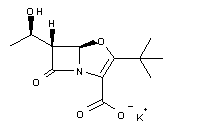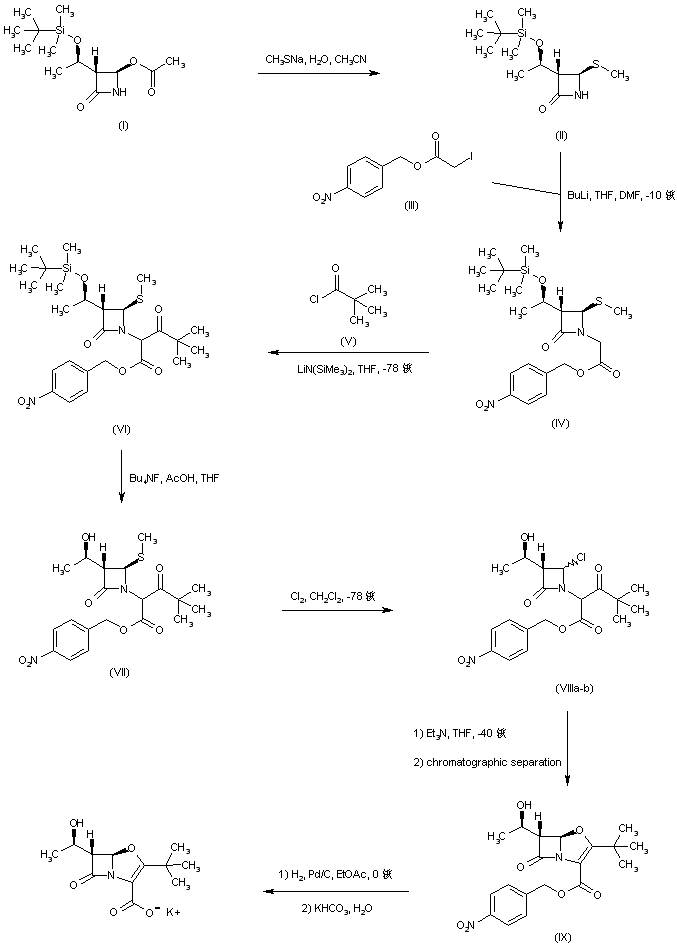 Azetidinone acetate (I) was treated with sodium methanethiolate to produce thioether (II). Lactam (II) N-alkylation with p-nitrobenzyl iodoacetate (III) furnished the azetidineacetate (IV). The lithium enolate of ester (IV) was subsequently acylated with pivaloyl chloride (V) at low temperature to afford keto ester (VI). The silyl protecting group of (VI) was then removed by treatment with tetrabutylammonium fluoride, yielding alcohol (VII). Chlorination of (VII) with concomitant oxidative cleavage of the methylthio group at -78 C gave rise to the chloroazetidine (VIII). Cyclization of (VIII) to the key oxapenem bicyclic system was accomplished by treatment with triethylamine in cold THF. Chromatographic separation of the resultant mixture of cis/trans bicyclic compounds afforded the desired isomer (IX). After hydrogenolysis of the p-nitrobenzyl ester group of (IX), the resultant carboxylic acid was converted to the required potassium salt by treatment with aqueous potassium bicarbonate.