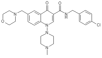 The reductocondensation of 3-bromo-4-fluorobenzaldehyde (I) with morpholine (II) by means of NaBH(OAc)3 in dichloroethane gives 4-(3-bromo-4-fluorobenzyl)morpholine (III), which is condensed with N-methoxy-N-methylacetamide (IV) by means of BuLi in THF to yield 1-[2-fluoro-5-(4-morpholinylmethyl)phenyl]ethanone (V). The reaction of (V) with an excess diethyl carbonate (VI) by means of NaH affords the 3-oxopropanoate derivative (VII), which is treated with triethyl orthoformate (VIII) and Ac2O at 150 C to provide the ethoxymethylene compound (IX). The reaction of (IX) with piperazine-1-amine (X) in ethanol gives the aminomethylene derivative (XI), which is cyclized by means of NaH in hot THF to yield the quinolone-3-carboxylate (XII). Finally, this compound is condensed with 4-chlorobenzylamine (XIII) by heating at 190 C to afford the target quinolone-3-carboxamide.