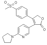 6-Chloronicotinic acid (I) is converted to the corresponding acid chloride (II) employing either SOCl2 or PCl5/POCl3. Treatment of acid chloride (II) with EtOH and Et3N, followed by reduction of the resultant ethyl ester with LiAlH4, furnishes 6-chloro-3-pyridylmethanol (III). Alcohol (III) is alternatively prepared by NaBH4 reduction of acid chloride (II). Chlorination of (III) by using SOCl2 gives the chloromethyl pyridine (IV), and further chloride displacement with KCN leads to nitrile (V). Substitution of the remaining chloride group of (V) upon heating with pyrrolidine (VI) furnishes the pyrrolidinyl pyridine (VII). Then hydrolysis of the nitrile function of (VII) under acidic conditions provides carboxylic acid (VIII). Bromination of 4-(methylsulfonyl)acetophenone (IX) in the presence of AlCl3 produces the phenacyl bromide (X). Finally, condensation between acid (VIII) and bromo ketone (X) under basic conditions gives rise to the title diaryl furanone