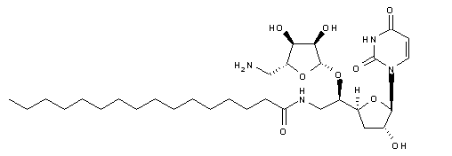 The reaction of the epoxy-glucoside (I) with Tms-N3 in DMF gives the azido-glucoside (II), which is treated with Pmb-Cl and NaH in DMF to yield the aryl ether protected glucoside (III). The cleavage of the acetonide group of (III) by means of HOAc/water affords the dihydroxy compound (IV), which is acylated by means of Ac2O and pyridine to provide the diacetate (V). The condensation of (V) with uracil (VI) by means of BSA and Tms-Br in acetonitrile gives the uridine derivative (VII), which is reduced at its azido group by means of H2 over Pd/C in ethyl acetate to yield the amino derivative (VIII). The condensation of (VIII) with palmitic anhydride (IX) affords the corresponding amide (X), which is selectively deprotected by means of TFA to provide the alcohol (XI). The condensation of (XI) with 5-azido-5-deoxy-1,2,3-O-triacetyl-alpha-D-ribofuranose (XII) by means of SnCl4 in dichloromethane provides the uridine derivative (XIII), which is deacetylated by means of MeONa in methanol to give the azido precursor (XIV). Finally, the azido group of (XIV) is reduced by means of H2 over Pd/C in methanol to yield the target compound.