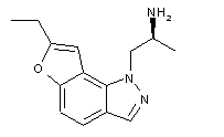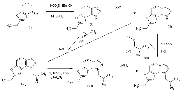 The cyclization of 2-ethyl-4,5,6,7-tetrahydrobenzofuran-4-one (I) with ethyl formate and hydrazine by means of tBu-OK in THF gives the furo[2,3-g]indazole derivative (II), which is aromatized by means of DDQ in dioxane, yielding intermediate (III). Finally, this compound is condensed with N-(tert-butoxycarbonyl)-O-(tosyl)-L-alaninol (IV) by means of Cs2CO3 in DMF, followed by a treatment with HCl to afford the target YM-348. Alternatively, intermediate (III) is condensed with (R)-propylene oxide (V) by means of NaH in THF to give the propanol derivative (VI), which is treated first with mesyl chloride and TEA in dichloromethane, and then with Na-N3 in DMF to yield the azide (VII). Finally, this compound is reduced with LiAlH4 in THF to afford the target amine YM-348.