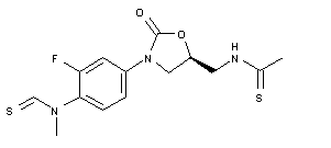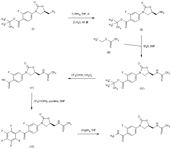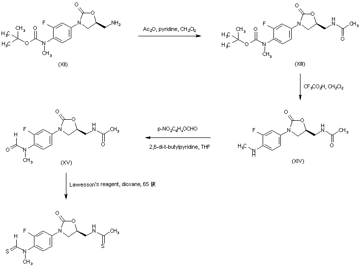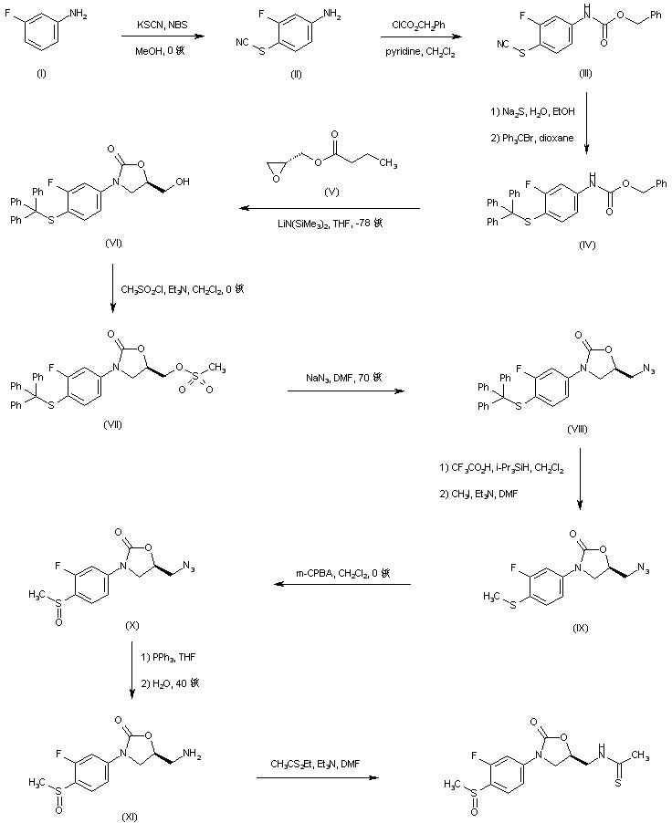 Addition of thiocyanogen (generated in situ from KSCN and N-bromosuccinimide) to 3-fluoroaniline (I) gave the thiocyanoaniline (II). Subsequent acylation of aniline (II) with benzyl chloroformate afforded carbamate (III). The intermediate thiol produced by treatment of thiocyanate (III) with sodium sulfide was captured as the trityl sulfide (IV) upon quenching with bromotriphenylmethane. The chiral oxazolidinone (VI) was then obtained by condensation of the lithium salt of carbamate (IV) with (R)-glycidyl butyrate (V). Activation of the primary hydroxyl of (VI) as the corresponding mesylate (VII), followed by displacement with NaN3 in hot DMF gave rise to the alkyl azide (VIII). Removal of the S-trityl protecting group of (VIII) by means of trifluoroacetic acid and triisopropylsilane and further alkylation of the resultant thiol with iodomethane yielded the methyl sulfide (IX). Sulfoxide (X) was then obtained by oxidation of sulfide (IX) with m-chloroperbenzoic acid. Reduction of the azido group of (X) to the required amine (XI) was accomplished by treatment with triphenylphosphine followed by aqueous hydrolysis. Finally, condensation of amine (XI) with ethyl dithioacetate furnished the title thioacetamide.