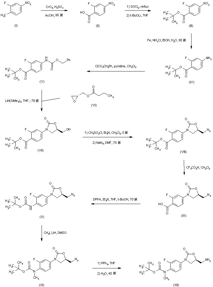 Jones oxidation of 2-fluoro-4-nitrotoluene (I) afforded carboxylic acid (II). After activation of (II) as the corresponding acid chloride with SOCl2, reaction with lithium tert-butoxide furnished the tert-butyl ester (III). Reduction of the nitro group of (III) by means of iron powder in the presence of ammonium chloride gave amine (IV), which was converted to carbamate (V) upon treatment with benzyl chloroformate. The chiral oxazolidinone (VII) was prepared by condensation of the lithium salt of carbamate (V) with (R)-glycidyl butyrate (VI). After activation of the primary hydroxyl of (VII) as the corresponding mesylate, displacement with NaN3 in hot DMF provided the alkyl azide (VIII). Tert-Butyl ester cleavage in (VIII) by means of trifluoroacetic acid afforded the carboxylic acid (IX). Curtius rearrangement of acid (IX) with diphenylphosphoryl azide in the presence of tert-butanol generated the tert-butyl carbamate (X). Further N-alkylation of carbamate (X) using iodomethane and LiH gave the N-methyl analogue (XI). Then, reduction of the azido group of (XI) to the primary amine (XII) was accomplished by treatment with triphenylphosphine followed by aqueous hydrolysis.