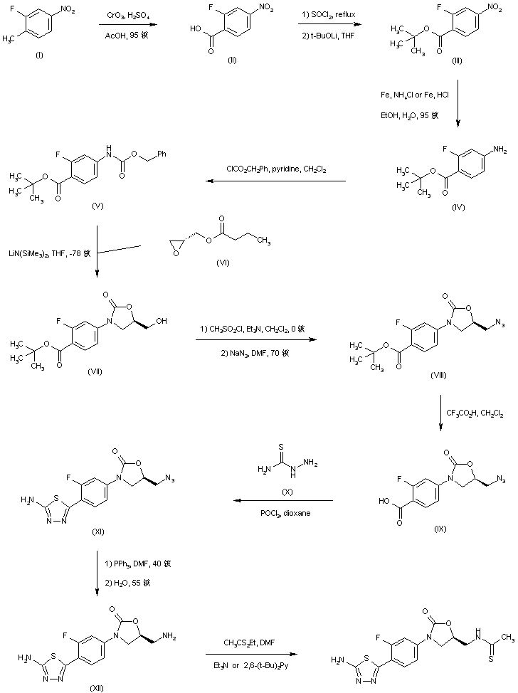 Oxidation of 2-fluoro-4-nitrotoluene (I) by means of Jones reagent afforded the benzoic acid (II). After activation of (II) as the corresponding acid chloride with SOCl2, reaction with lithium tert-butoxide furnished the tert-butyl ester (III). Reduction of the nitro group of (III) by means of iron powder gave amine (IV), which was further converted into the carbamate (V) upon treatment with benzyl chloroformate. The chiral oxazolidinone (VII) was prepared by condensation of the lithium salt of carbamate (V) with (R)-glycidyl butyrate (VI) at -78 C. After activation of the primary hydroxyl of (VII) as the corresponding mesylate, displacement with NaN3 in hot DMF provided the alkyl azide (VIII). Tert-Butyl ester cleavage in (VIII) employing trifluoroacetic acid afforded the carboxylic acid (IX), which was cyclized to the thiadiazole (XI) by condensation with thiosemicarbazide (X) in the presence of POCl3. Reduction of the azido group of (XI) to the primary amine (XII) was accomplished by treatment with triphenylphosphine followed by aqueous hydrolysis. Finally, acylation of the aliphatic amino group of (XII) with ethyl dithioacetate gave rise to the title thioacetamide.