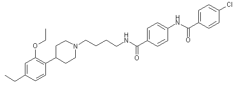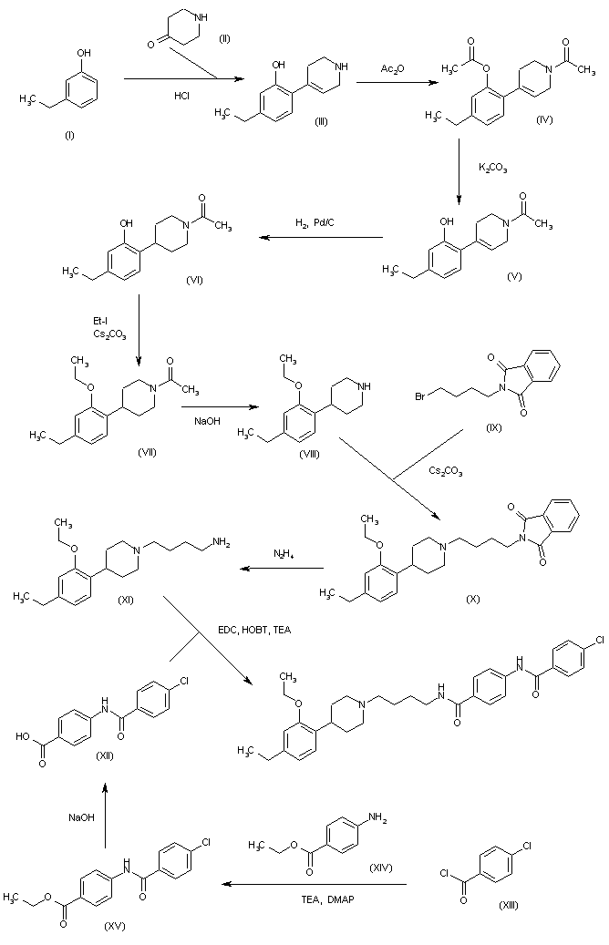| 合成路线图解说明: The condensation of 3-ethylphenol (I) with 4-piperidone (II) by means of gaseous HCl in acetic acid gives 5-ethyl-2-(1,2,3,6-tetrahydropyridin-4-yl)phenol (III), which is treated with acetic anhydride in pyridine to yield the diacetyl derivative (IV). The selective hydrolysis of the O-acetyl group of (IV) by means of K2CO3 in methanol affords the phenol derivative (V), which is hydrogenated with H2 over Pd/C in methanol to provide the acetyl piperidine (VI). The alkylation of the phenolic group of (VI) with ethyl iodide and Cs2CO3 in refluxing acetone gives 1-acetyl-4-(2-ethoxy-4-ethylphenyl)piperidine (VII), which is deacetylated by means of NaOH in refluxing methanol to yield 4-(2-ethoxy-4-ethylphenyl)piperidine (VIII). The alkylation of the piperidine (VIII) with N-(4-bromobutyl)phthalimide (IX) by means of Cs2CO3 in refluxing acetone affords the adduct (X), which is cleaved with hydrazine in hot methanol to provide 1-(4-aminobutyl)-4-(2-ethoxy-4-ethylphenyl)piperidine (XI). Finally, this amine is condensed with 4-(4-chlorobenzamido)benzoic acid (XII) by means of EDC, HOBT and TEA in DMF to give the target diamide.