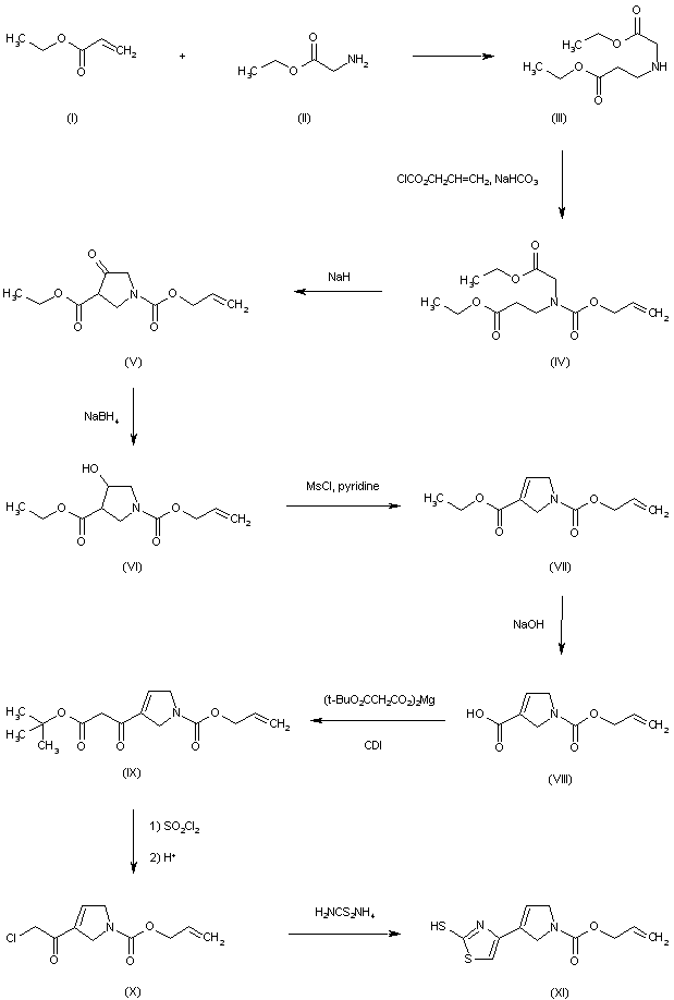 Michael addition of ethyl acrylate (I) to glycine ethyl ester (II) produces the amino diester (III), which is protected as the allyl carbamate (IV) by treatment with allyl chloroformate. Dieckmann cyclization of diester (IV) in the presence of NaH leads to pyrrolidinone (V). After reduction of (V) to the corresponding alcohol (VI) with NaBH4, dehydration by means of methanesulfonyl chloride and pyridine furnishes the conjugated ester (VII). Acid (VIII), obtained by alkaline hydrolysis of (VII), is then condensed with magnesium tert-butyl malonate in the presence of CDI to produce keto ester (IX). Chlorination of (IX) with sulfuryl chloride, followed by acidic decarboxylation gives rise to chloro ketone (X). This is then condensed with ammonium dithiocarbamate to generate the 2-mercapto thiazole (XI)