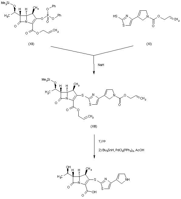 Coupling of the carbapenem phosphate (XII) with mercaptothiazole (XI) furnishes thioether (XIII). Finally, desilylation of (XIII), followed by palladium-catalyzed removal of the allyl ester and carbamate groups provides the title compound