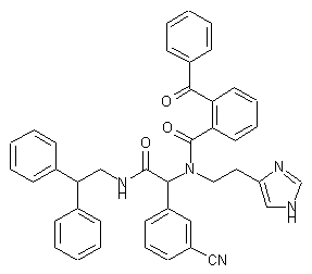 The title compound is prepared according to the Ugi reaction by combination of the four components: isocyanide (III), m-cyanobenzaldehyde (IV), 2-benzoylbenzoic acid (V), and histamine (VI) in refluxing MeOH