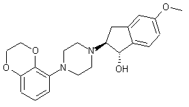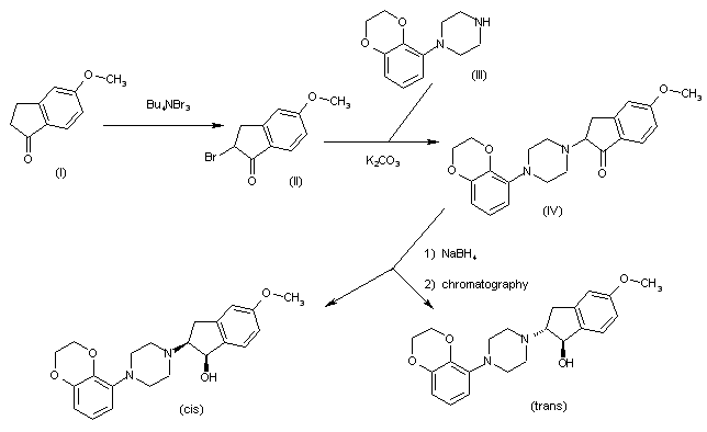 The bromination of 5-methoxy-1-indanone (I) with Bu4NBr3 in dichloromethane gives the 2-bromo derivative (II), which is condensed with 1-(2,3-dihydro-1,4-benzodioxin-5-yl)piperazine (III) by means of K2CO3 in THF to yield 2-[4-(2,3-dihydro-1,4-benzodioxin-5-yl)piperazin-1-yl]-5-methoxy-1-indanone (IV). Finally, this compound is reduced by means of NaBH4 in THF to afford the target compound as a mixture of the (cis) and (trans) racemates that are separated by chromatography.