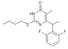 The condensation of 2-(2,6-difluorophenyl)acetic acid (I) with 2-methyllmalonic acid monoethyl ester sodium salt (II) gives 4-(2,6-difluorophenyl)-2-methyl-3-oxobutyric acid ethyl ester (III), which is cyclized with thiourea (IV) to yield 6-(2,6-difluorobenzyl)-5-methyl-2-thioxo-1,2,3,4-tetrahydropyrimidin-4-one (V). Finally this compound is reacted with 1-ethylpropyl chloride (VI) by means of K2CO3 to afford the target pyrimidinone.
