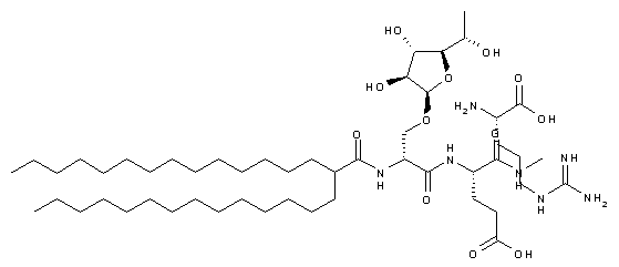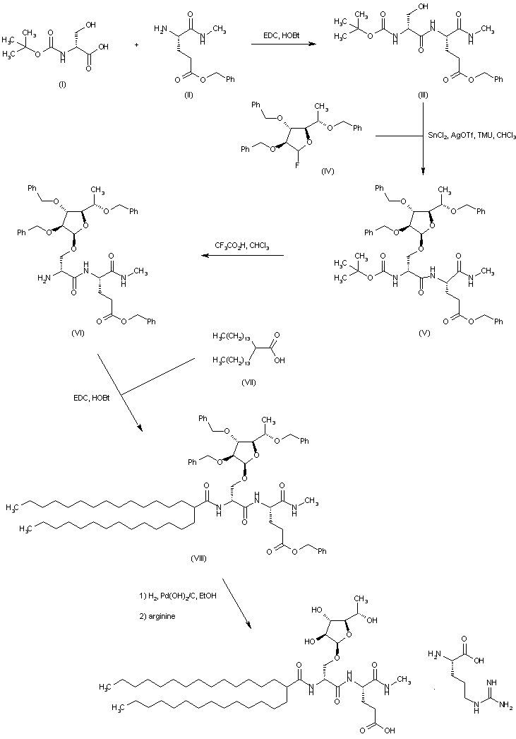 Coupling of N-Boc-D-serine (I) with L-glutamic acid 1-methylamide 5-benzyl ester (II) by means of EDC and HOBt affords the dipeptide derivative (III). Subsequent glycosylation of the serine hydroxyl group of (III) with the perbenzylfucose donor (IV) in the presence of SnCl2 and AgOTf gives the alpha-glycoside (V). The N-Boc protecting group of (V) is removed under acidic conditions to furnish amine (VI), which is acylated by 2-tetradecylhexadecanoic acid (VII), yielding amide (VIII). The O-benzyl protecting groups of (VIII) are then removed by hydrogenolysis in the presence of Pearlman's catalyst, and the resultant carboxylic acid is finally converted to the corresponding arginine salt.