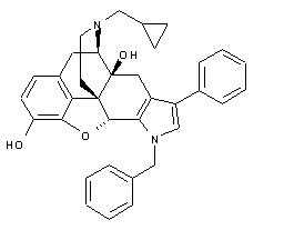 Condensation of naltrexone (I) with benzylamine produces the intermediate imine (II) which is subsequently cyclized with trans-beta-nitrostyrene (III) to produce the required pyrrolomorphinan.