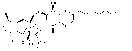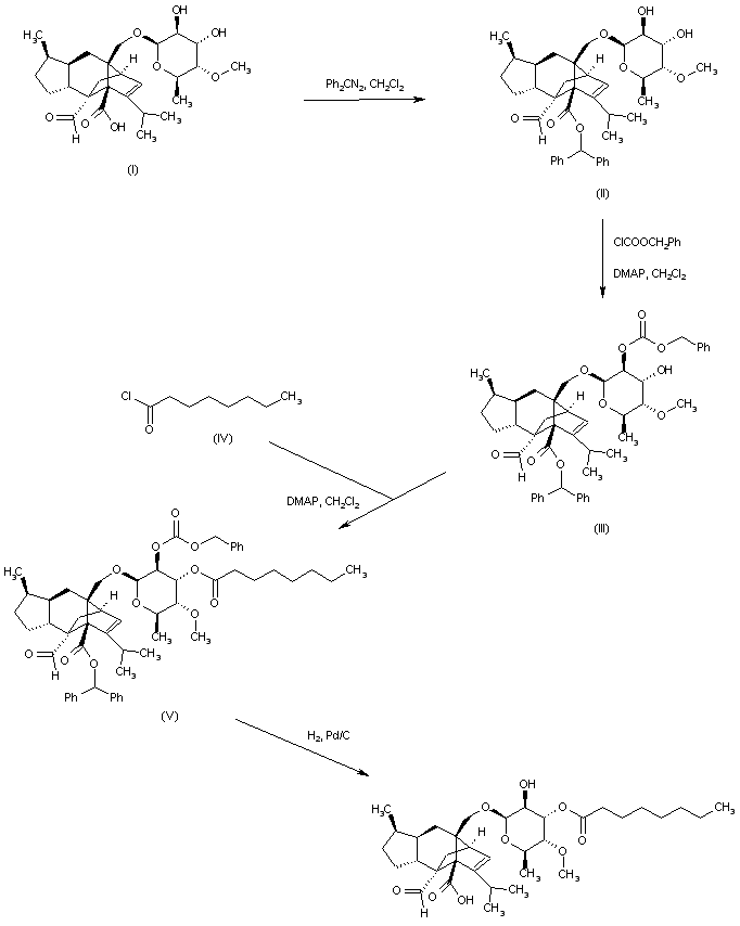 Sordarin (I) was isolated from culture broths of Sordaria araneosa. Protection of the carboxyl group of (I) as the benzhydryl ester (II) was effected by treatment with diphenyl diazomethane. The 2'-hydroxyl group of (II) was subsequently blocked as the carbonate ester (III) by selective acylation with benzyl chloroformate in the presence of DMAP. Subsequent esterification of the 3'-hydroxyl of (III) with octanoyl chloride (IV) furnished the octanoate ester (V). The benzhydryl ester and benzyl carbonate protecting groups of (V) were finally removed by catalytic hydrogenation over Pd/C.