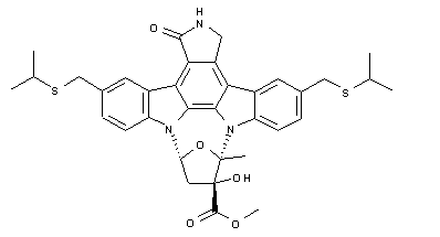 Preparation of intermediate (VI) has been reported by two related ways. The nonselective methylation of alkaloid K252a (V) with methyl iodide in the presence of NaH yielded the required O-methyl compound (VI) along with the N-methyl and the N,O-dimethyl derivatives, which were separated by silica gel chromatography. A large-scale process for the regioselective synthesis of ether (VI) was further developed. Selective protection of the amide group of (V) with tert-butyldimethylsilyl chloride gave the N-silyl derivative (VII), which was O-methylated with methyl iodide to afford methyl ether (VIII). Desilylation under acidic conditions then gave (VI). Subsequent reduction of the ester group of (VI) with with NaBH4 in THF/MOH provided alcohol (IX). This was coupled with dipeptide (IV) using DCC and NMM to afford ester (X). The Boc protecting groups were finally cleaved by treatment with HCl in EtOAc.