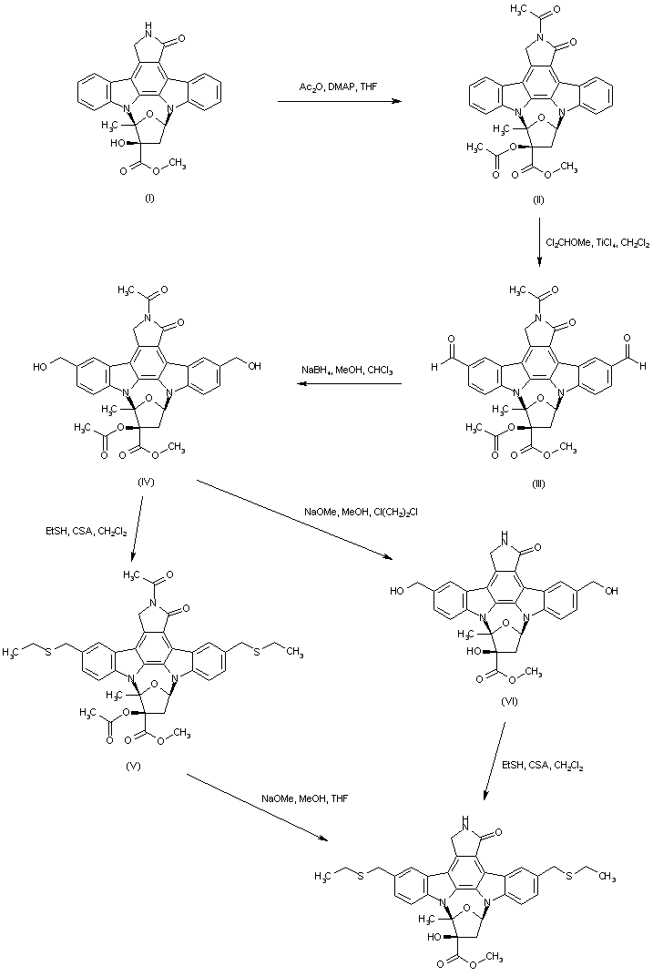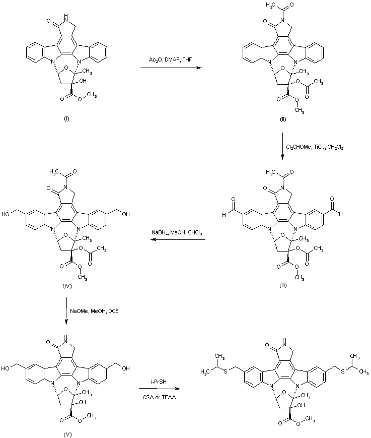 The known K-252a (I) was protected as its diacetyl derivative (II) by treatment with Ac2O in the presence of DMAP. Diacetyl-K-255a (II) was converted to 3,9-dialdehyde (III) by formylation with dichloromethyl methyl ether and TiCl4. After NaBH4 reduction of dialdehyde (III) to the corresponding diol (IV), the acetyl groups were deprotected using catalytic NaOMe in MeOH. The deprotected diol (V) was finally condensed with 2-propanethiol in the presence of either camphorsulfonic acid or trifluoroacetic anhydride to furnish the target bis(thioether) derivative.