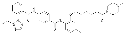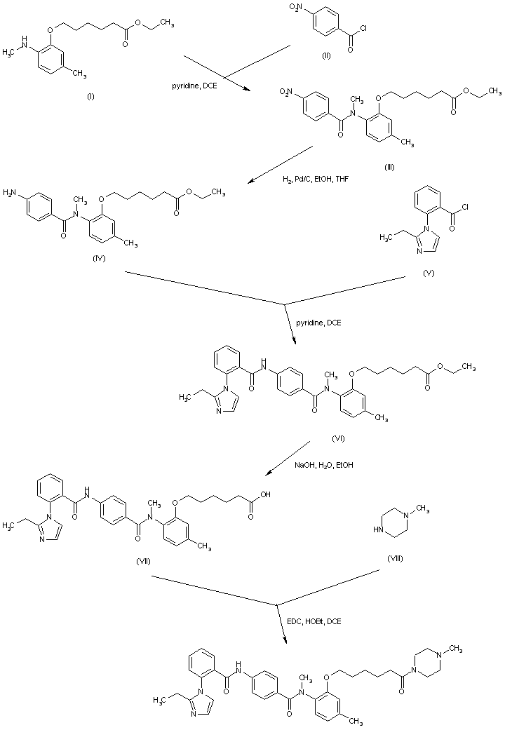 Acylation of the anilino ester (I) with 4-nitrobenzoyl chloride (II) affords amide (III). After reduction of the 4-nitrobenzamide (III) by catalytic hydrogenation, the resultant amine (IV) is condensed with (2-ethyl-1-imidazolyl)benzoyl chloride (V) to furnish diamide (VI). Subsequent ester group saponification in (VI) gives acid (VII). This is finally coupled with N-methylpiperazine (VIII) in the presence of EDC and HOBt to produce the title compound.