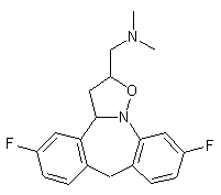 The condensation of 3-fluoroaniline (I) with 4-fluorobenzonitrile (II) by means of BCl3 and AlCl3 in xylene at 120 C gives the benzophenone (III), which is reduced with hydrazine and KOH in ethyleneglycol at 200?C to yield the diphenylmethane (IV). The acylation of the NH2 group of (IV) with refluxing formic acid affords the formamide (V), which is cyclized by means of PPA and POCl3 in xylene at 100 C to provide the dibenzazepine (VI). The reduction of (VI) with H2 over Pd/C in THF/methanol gives the corresponding dihydro compound (VII), which is oxidized with 3-phenyl-2-(phenylsulfonyl)oxaziridine (VIII) in dichloromethane to yield the N-oxide (IX). Finally, this compound is cyclized with N-allyl-N,N-dimethylamine (X) by heating in toluene at 100 C to afford the target oxazolidine derivative. Alternatively, the cyclization of 5-fluoro-2-hydroxyaniline (XI) with 3-fluorobenzaldehyde (XII) by means of chloroacetic acid at 100 C in methanol or isopropanol gives 7-fluoro-2-(4-fluorophenyl)-2,4-dihydro-1H-3,1-benzoxazine (XIII), which is reduced with NaBH4 in refluxing ethanol to yield N-(3-fluorobenzyl)-N-[2-(hydroxymethyl)-5-fluorophenyl]amine (XIV). Finally, this compound is cyclized by means of H2SO4 in dichloromethane to afford the previously described dihydro-benzodiazepine (VII), which is worked up as before.